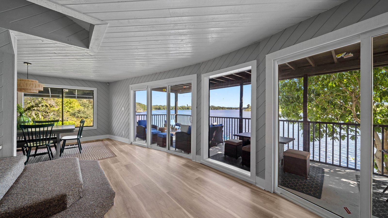 - A riverfront balcony on the first floor is decorated with soft sofas to spend some time in front of the water from this house.