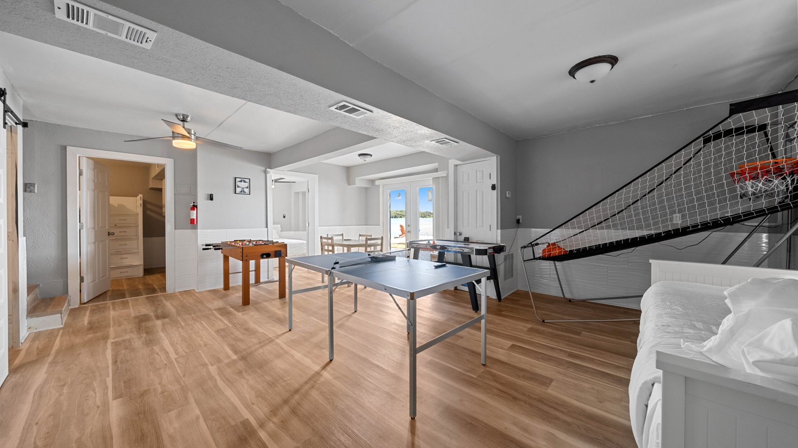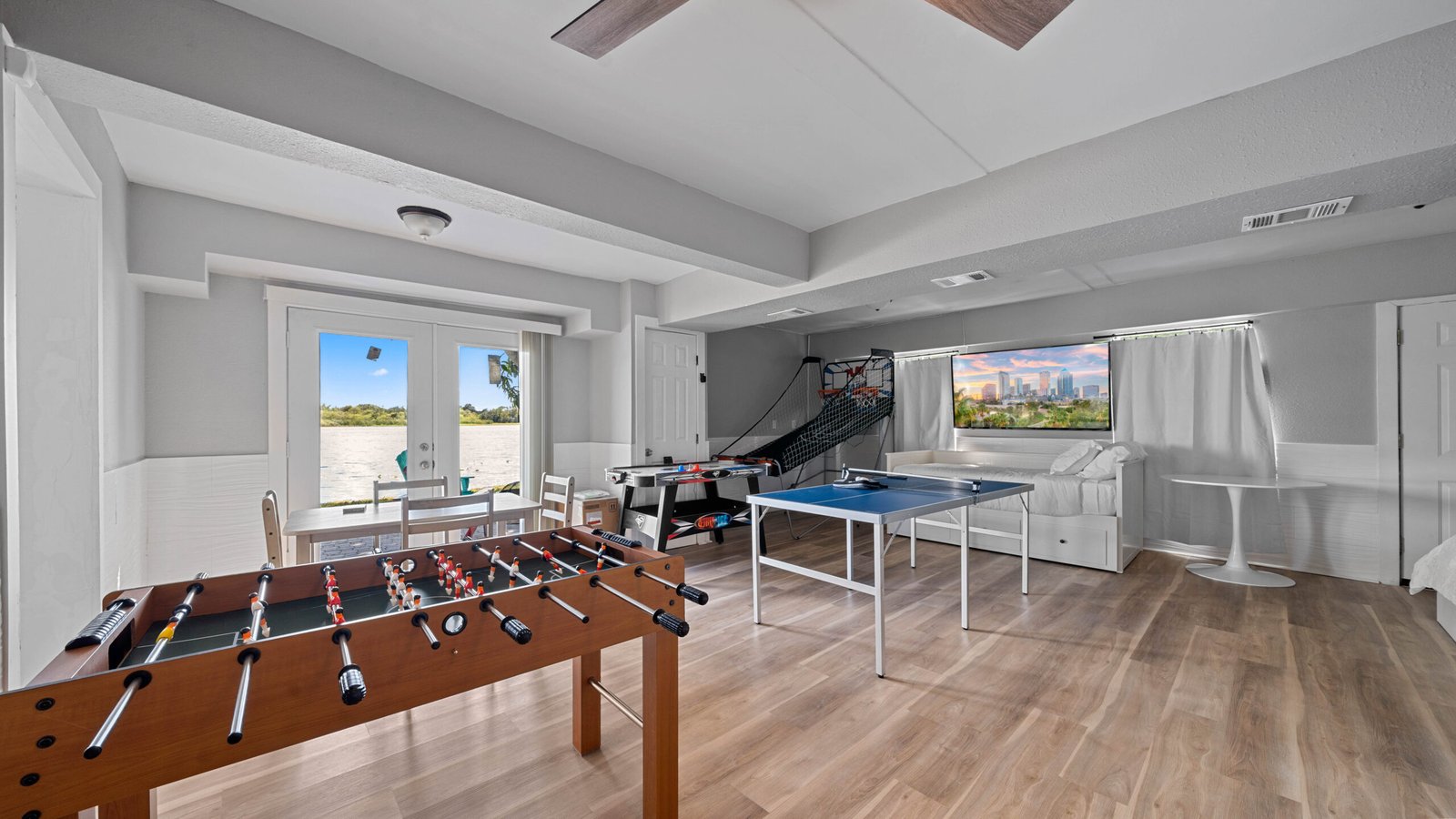 - Let the fun continue in our fully furnished gaming area. It includes a foosball table, Ping-Pong table, air hockey table, and basketball hoop.