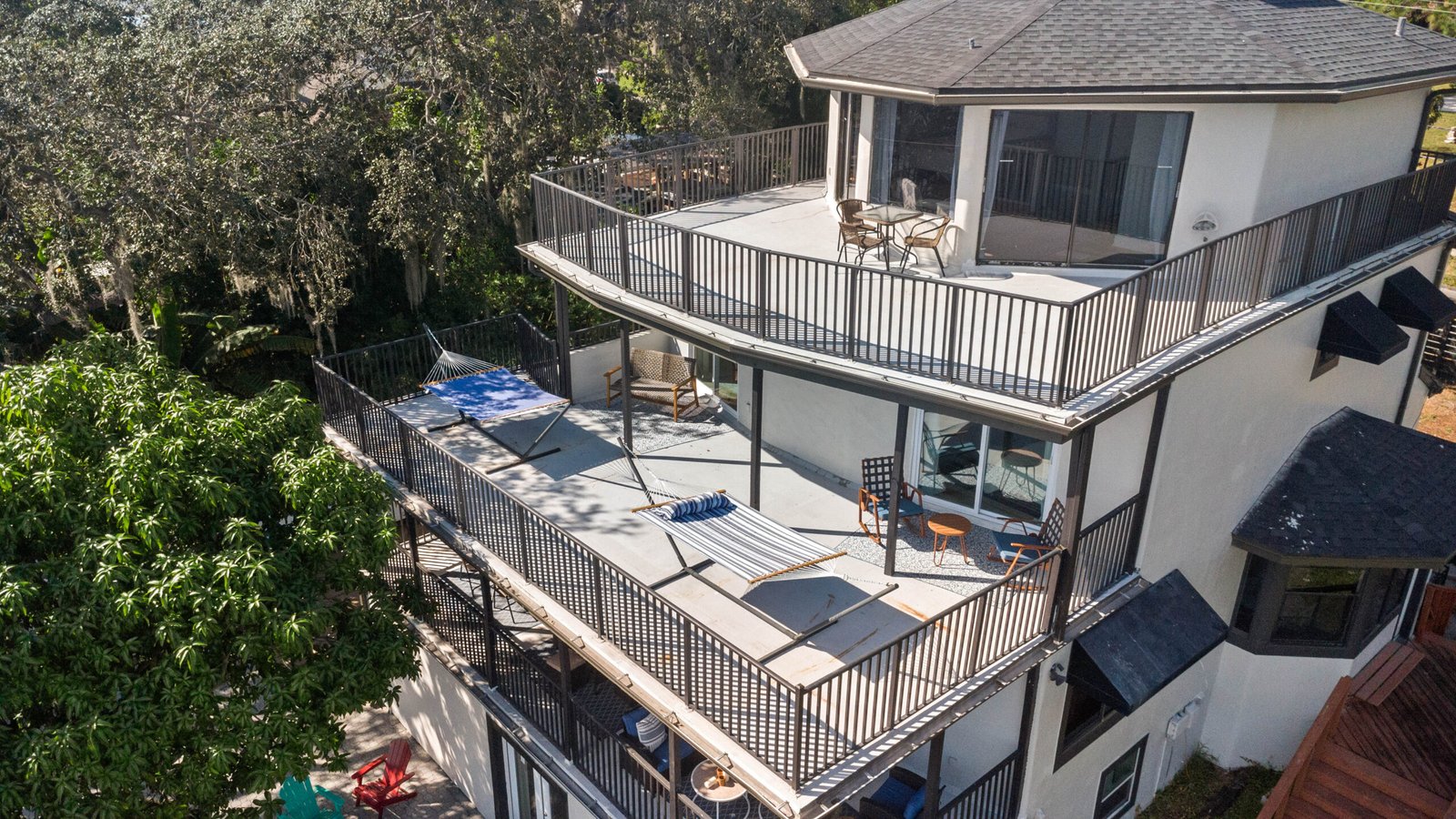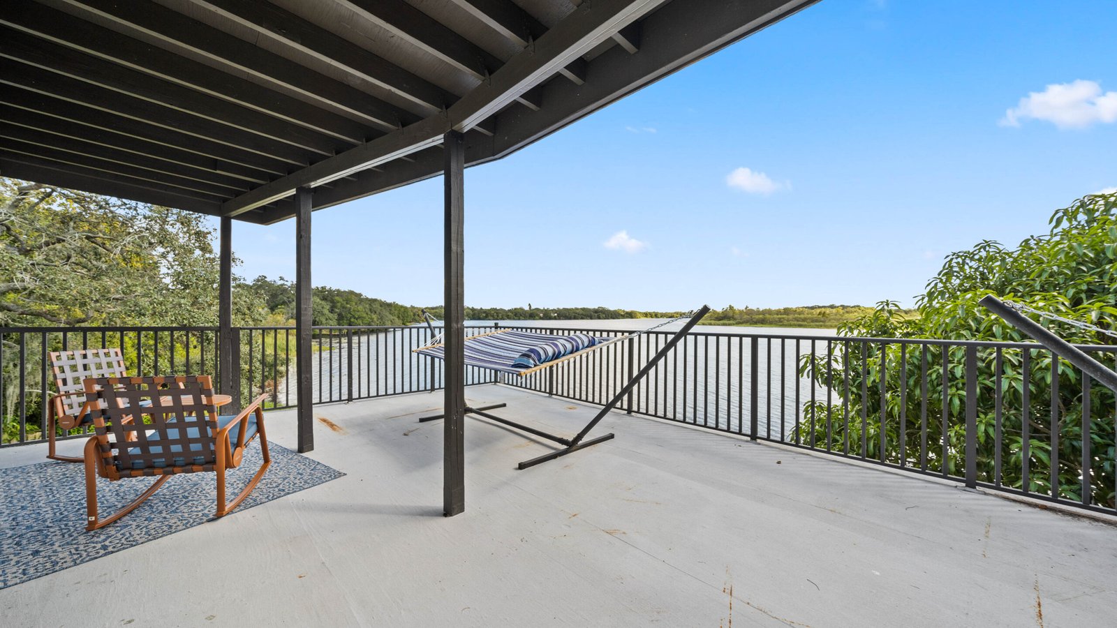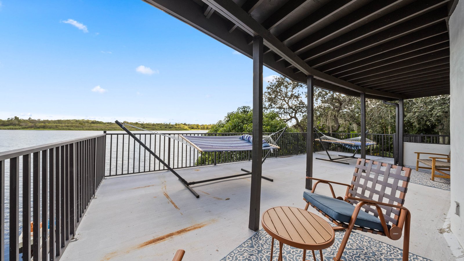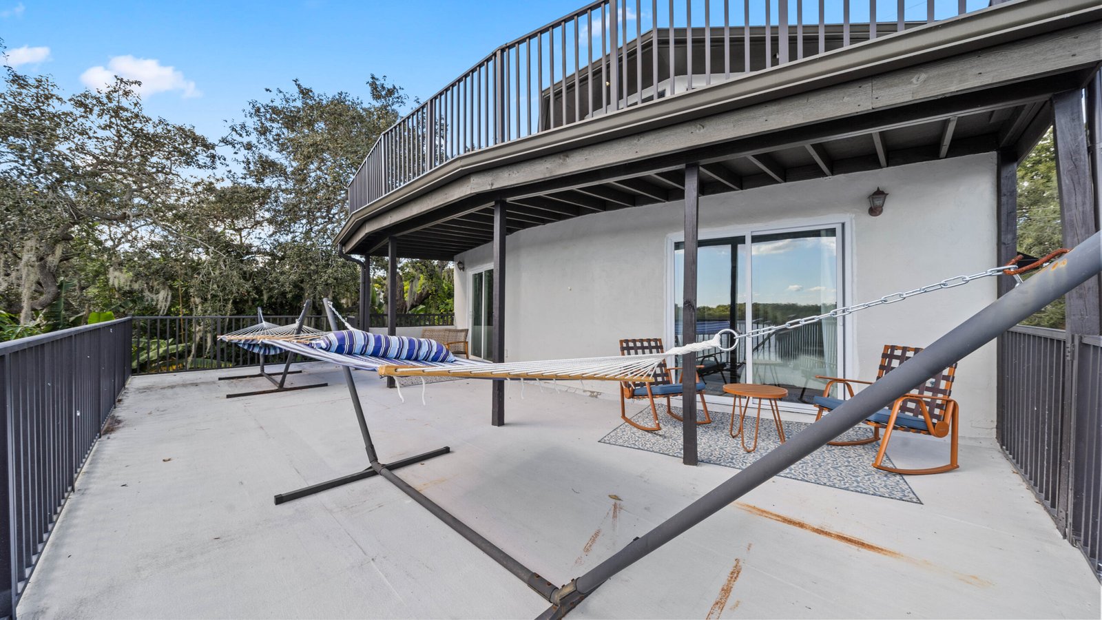 - Two adult hammocks are on the second-floor balcony in front of the river.